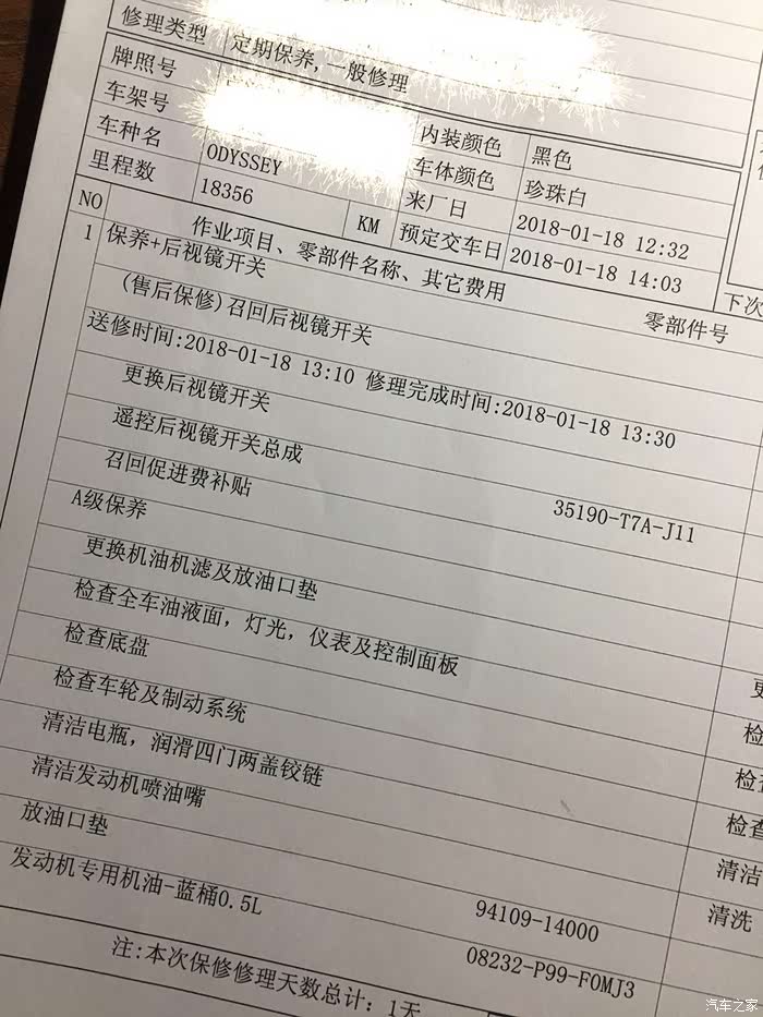 今天刚去给奥德赛做了保养,顺便解决了后视镜开关的召回。15年4月上牌,至今跑了1.8万公里,公里数确实不多,这车基本也就是带孩子出门的时候才开。三年来的感觉,有喜有忧吧。奥德赛的优点不少,但缺点也很多。不过同价位的MPV,或许也没有什么更好的选择。前些日子考虑过换GL8,换塞纳~~~但种种原因吧,包括质量,价格,油耗,维修保养的便利性,3.5L的每年的车船税(塞纳)等,最终还是放弃了。哦对,最主要的一点,开的不多,利用率与花的钱不成正比~~~呵呵。