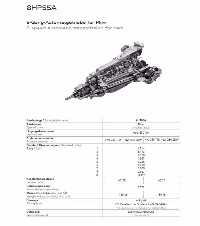 据了解,现在这款ZF 8速的具体型号是8HP55A,最大承受扭矩650Nm,如下图所示。因此,上面那个问题的答案是:没问题。