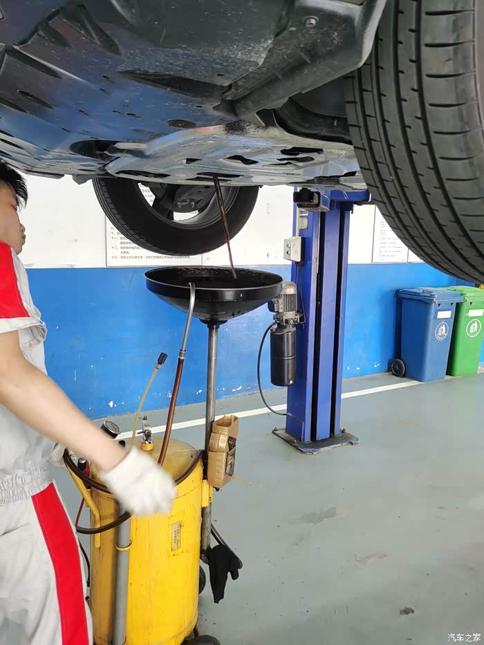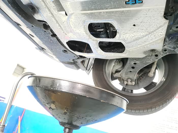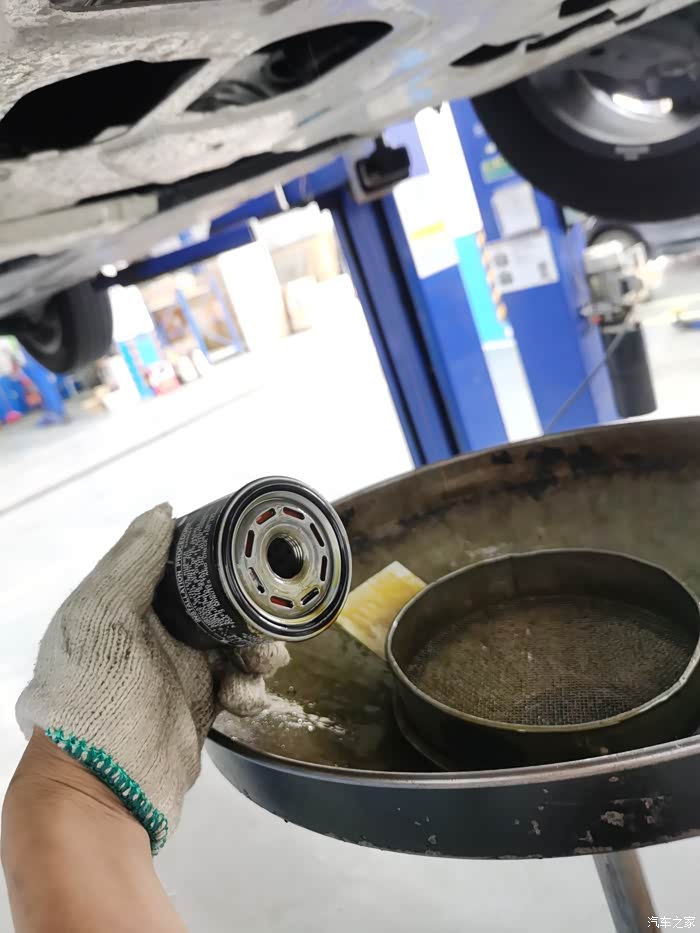 把两个滤清拿出来就把车子升高放机油,把机油滤清器弄出来,机油就漏出来放在回收桶的漏斗上。接着就去检查测量其他的项目。