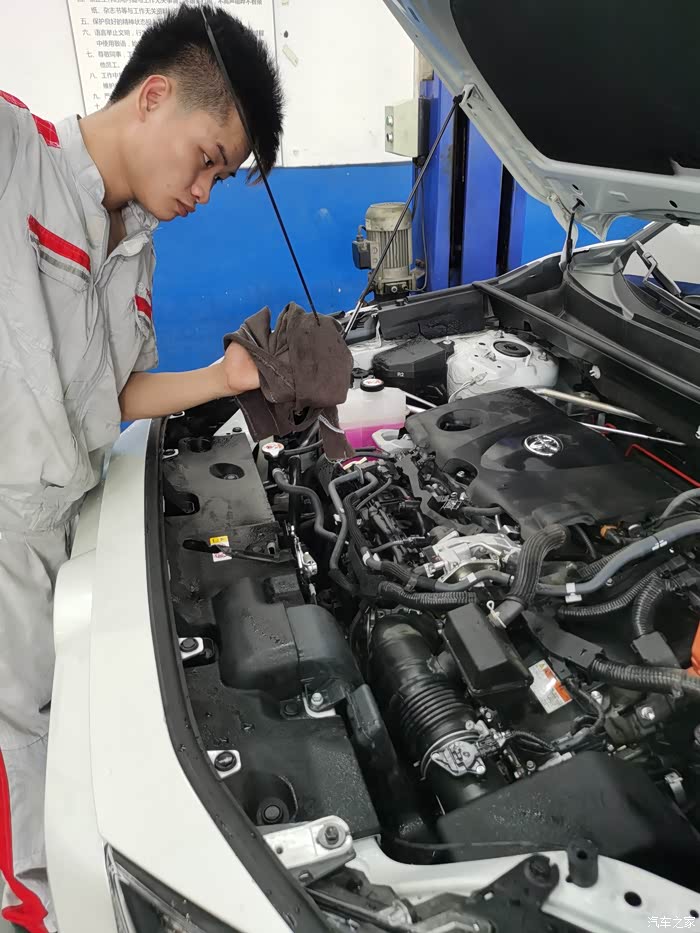 这时机油静置过了,可以检查机油入油量。先抽出机油标尺用毛巾擦干净,然后放回机油标尺,再抽出 观看机油液位是否在机油标志的上下限之间,反复检查看多次。确认过就关盖,本次保养完成,开去洗车就可以交车。