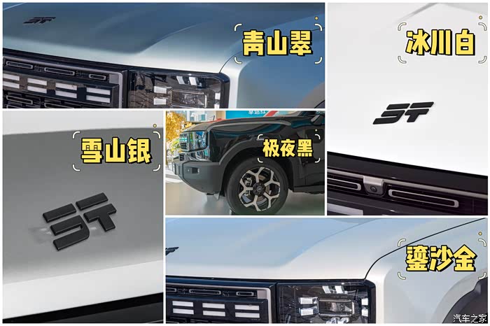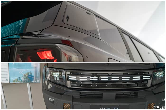 山海T1除了有极夜黑配色,还有冰川白、雪山银、青山翠,而鎏沙金配色的车漆更是加入了特殊颗粒,强光下明艳弱光下深邃,灵感正是来源于每年夏季日落夕阳映射下的赛里木湖面粼粼波光,确实不一般。