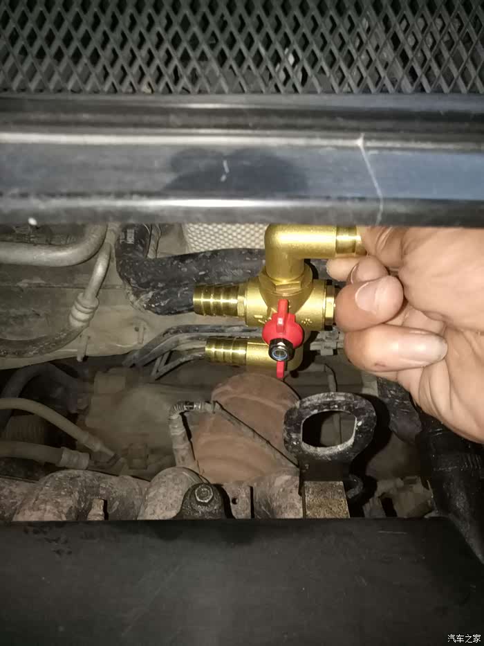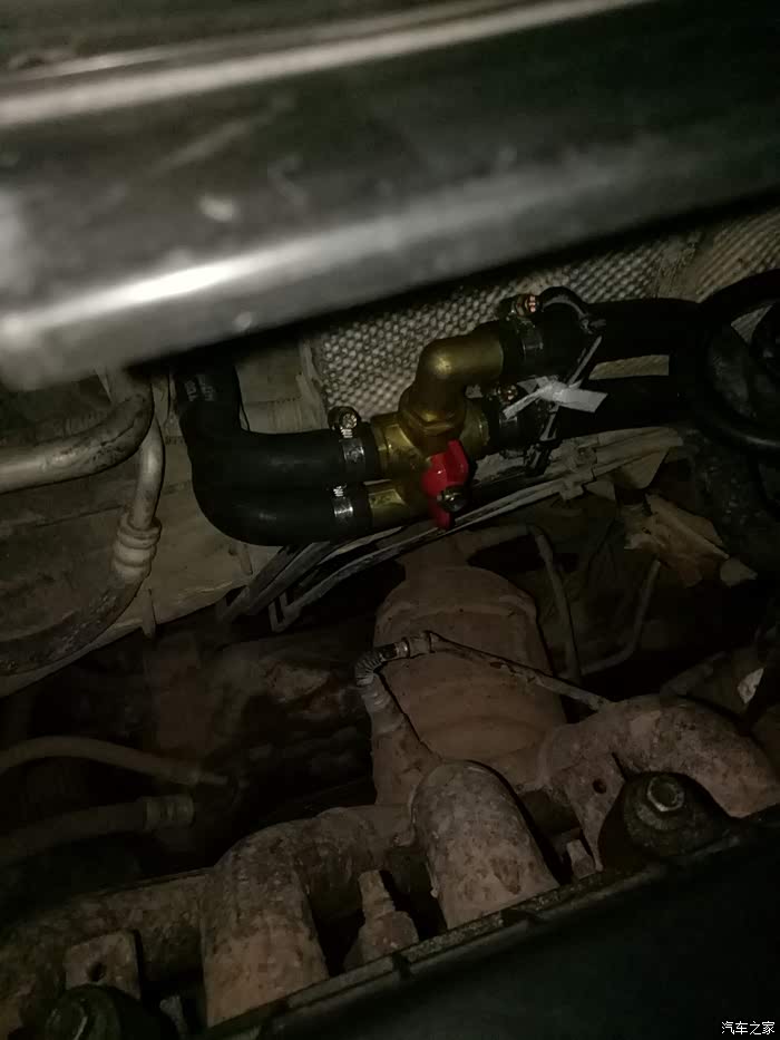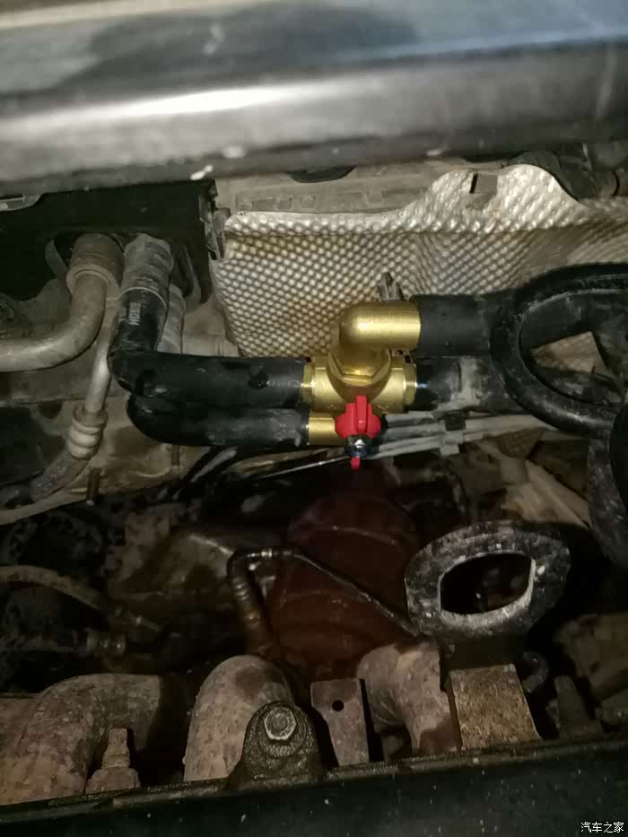 安装四通阀,从红线处剪断,注意防冷冻液会流出来。把管子口朝上就不会流了。安装完开冬天模式,打开空调,开暖风十分钟左右,然后切换成夏天模式就OK??。