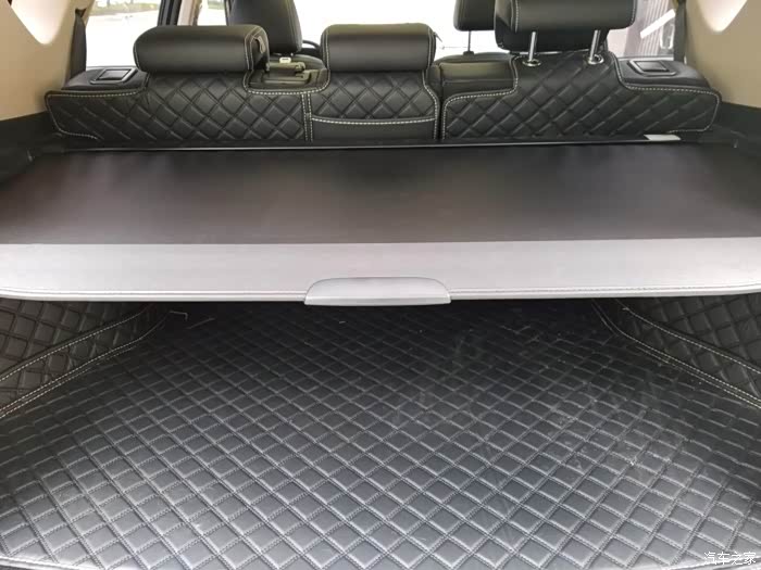 车内随处可见真皮质感,就这个后备箱也是的,上面的挡板都是可以拆卸的,空间是不错,开它自驾游省心。