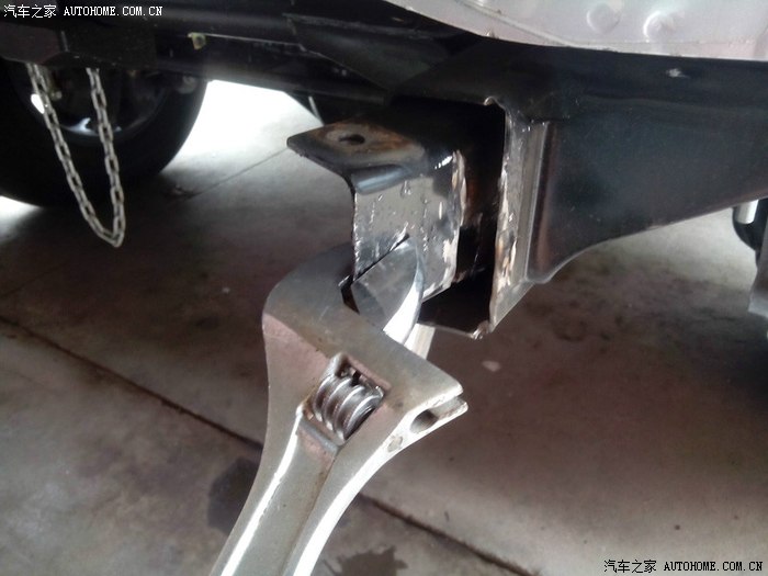 原厂的横梁取下了,但两端各有一小节纵梁焊在了大梁里,只能用切割机先将表面切开。不要伤着大梁,尽量对着纵梁切,反正要废掉。楼主一个人闷头拆了半天,这下终于出现了。