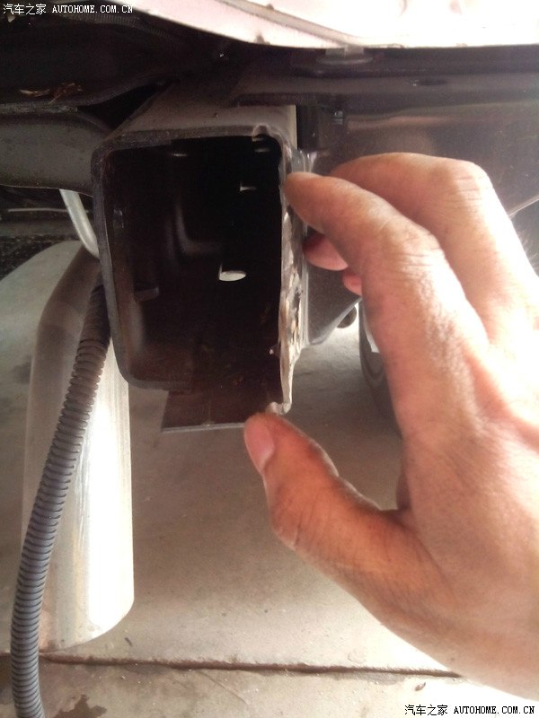 大梁的梁头,拖车杠就是要插在这里,切割面最好再涂点防锈漆。请忽略楼主那“黑手”。