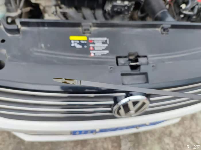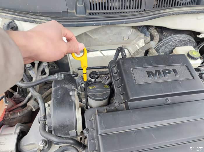 再接着就是检查重点——机油,检查机油液位时要先机油液位计拉出来,使用口纸擦干净末端的液位刻度,然后再次把液位计插入液位中重新拉出来,就可以看到机油的液位了,现在我的刻度尺上显示机油在中上部位,观察一切正常后,就把油尺复位就可。最后就是把发动机舱盖去掉支撑,重新盖好。