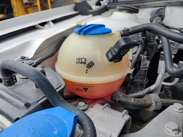 来到车辆旁边,首先打开驾驶室车门,在主驾左下角拉开发动机舱盖保险开关,接着把手伸进盖板缝隙里面,按压住舱门弹簧后往上用力就打开发动机舱了。接着要使用支架固定好发动机舱盖板,内部的发动机和各种油液就一览无余了。先把外漏能看到的部件都检查一遍,没有发现螺丝、皮带等异常,接着对冷冻液、刹车油、玻璃水的液位都仔细检查一下,其中刹车油盒是白色的,液位不太好看清,需要凑近仔细观察。