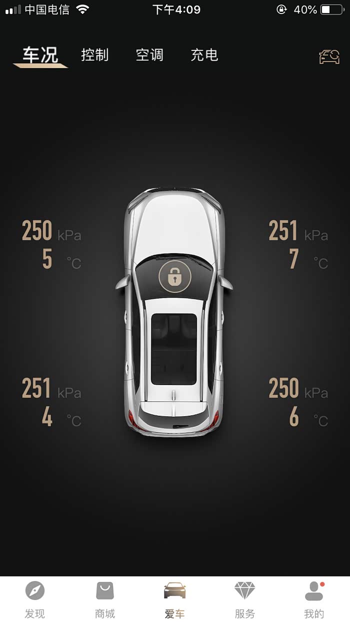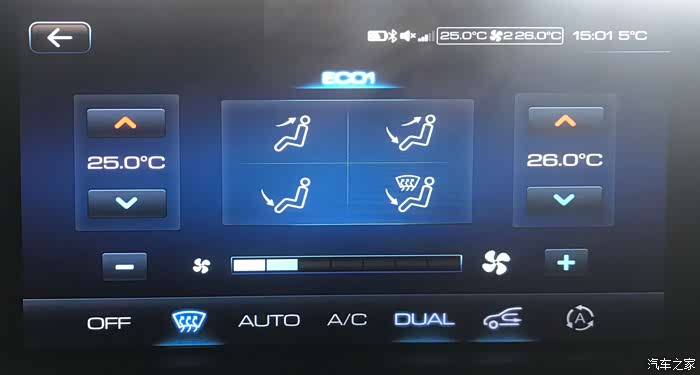 准备出发,今天温度还是可以的,启动车辆,发动机没有启动,在车库内按风量按钮开启空调。记忆了早上来时的设定。