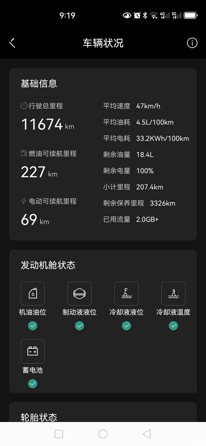春节期间行驶11674-10980=694公里,开30%保电,每次充电约剩余15公里的纯电行程,充满平均12.6度。即12.6度电可行驶54公里,这种天充满也只到69公里。平均每百公里电耗23.3度。全部充电65.2度,纯电行驶约281公里,纯油行驶413+20=433公里,耗油45.2-18.4=26.8L,百公里油耗6.19L。真实开出的数据,期间开的算比较暴力,好几次都是踩底0—100加速,高速120—140之间行驶。如果按照桥车百公里15度左右的电耗,则换算油耗低至4L以内。(6.18/(23.3/15)=3.98L)。总之用车成本不高,春节期间,不到4毛钱一公里。拿三缸机说事就算了,开得出也算本事,整车的隔音本身就不错。
