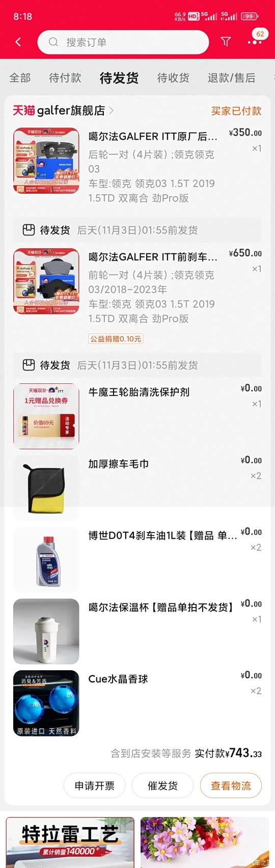 本人是19款领克03,行驶里程6.6 万公里,上次保养6万公里时4S 店就告知刹车片偏薄需更换,但是4s前后一套需要一千多,而且还没没现货。我就没换。然后自己就开始研究,自己对这方面也是一点经验没有,看网上,什么博世,法雷奥,布雷博都是大牌,然后价格也是有高有低。都不知道选什么好。经过车友群跟各平台搜索研究才知道了我们的原厂是葛尔法ITT刹车片,于是在电商平台找到了原厂配套的。趁活动价格也能接受,前后一起才七百多还还包安装。这玩意4s要一千多的,对比起来性价比就来了呀。