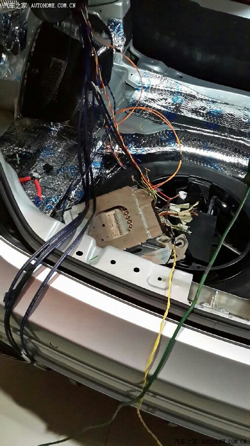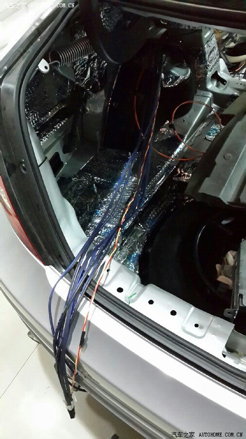 前车中控光纤及中置和四门喇叭线通通汇集到后备箱左侧,准备与功放对接