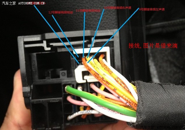导航后面接线方法, 6号脚和12号脚是空着的,准备(ECU端子5个直接对插(几毛钱一个),用专用卡钳压)4号,10号、11号脚原厂已经接了线,也是为无损接线,把导航后4,10,11线(ECU端子)用工具把他退出来,(不用的时候可以无损还原) 在把做好视频线分别插倒里边去! 在来说说4,10,11线是做什么的,11号是音频的地线,.4号是音频左声道,10号是音频右声道