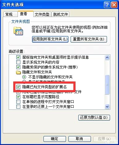 这个时候就得通过文件夹选项显示扩展名,可以打开任一个文件夹或我的电脑在工具选项里选择文件夹选项(截图以XP示例)
