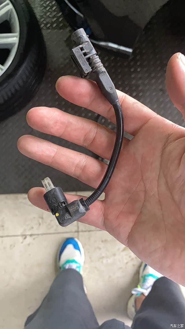 一看是左前轮断路,那就说明不是避震原因,是电路问题,查看了一番插头,没啥问题,好吧,清一下故障码,回家跑跑看看吧!于是紧张兮兮的往家跑,一路也没有提示故障,心里想应该可能就是哪次电压不稳吧,结果,刚到车位左转弯,灯亮了,万只草泥马在心中奔驰,于是,我自己在停车场附近来回测试,得出的结果是,一左转打死就故障码,这下似乎找到问题所在了,可能是左转抻着线影响插头松动原因,立马开车返回修车店,此刻威海又下起了大雨(我好像每次都赶着下雨天去整车),修车店架子和门口都有车在维修,我去了死缠烂打那个维修小哥才答应再帮我看看,不过人家的服务态度还是很不错的,只不过事太多而已。卸轮胎,然后左打死,故障码出现,小哥把倍适登b12与车的连接线拔下来,找了万用表一测,原因找到了,线头坏了(相信很多用苹果的车友都懂苹果数据线头坏的那种状况),当原始状态的时候线线是通的,线稍微一动,立马就不通了
