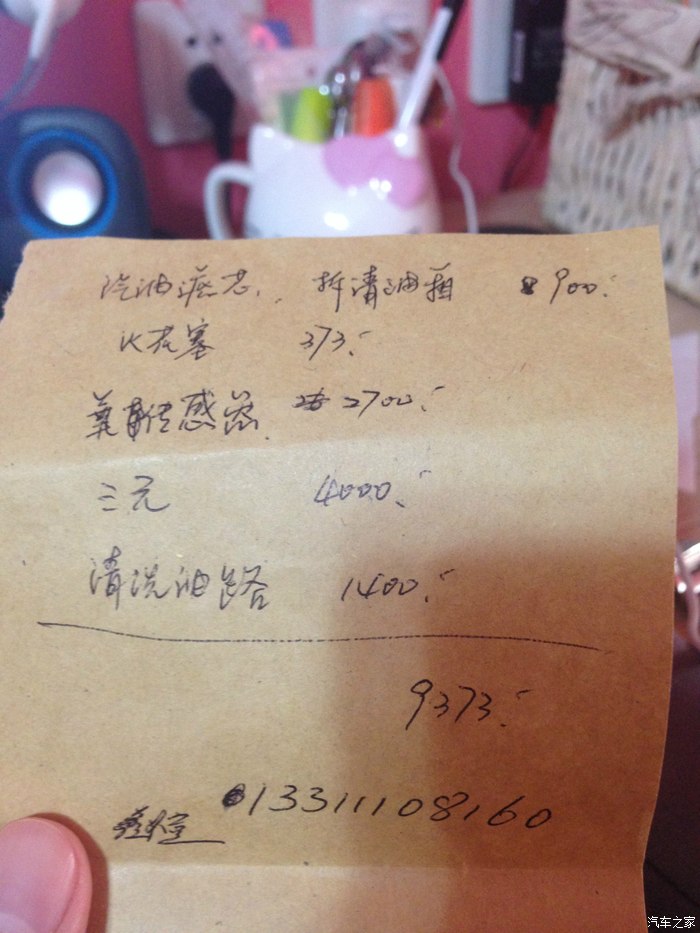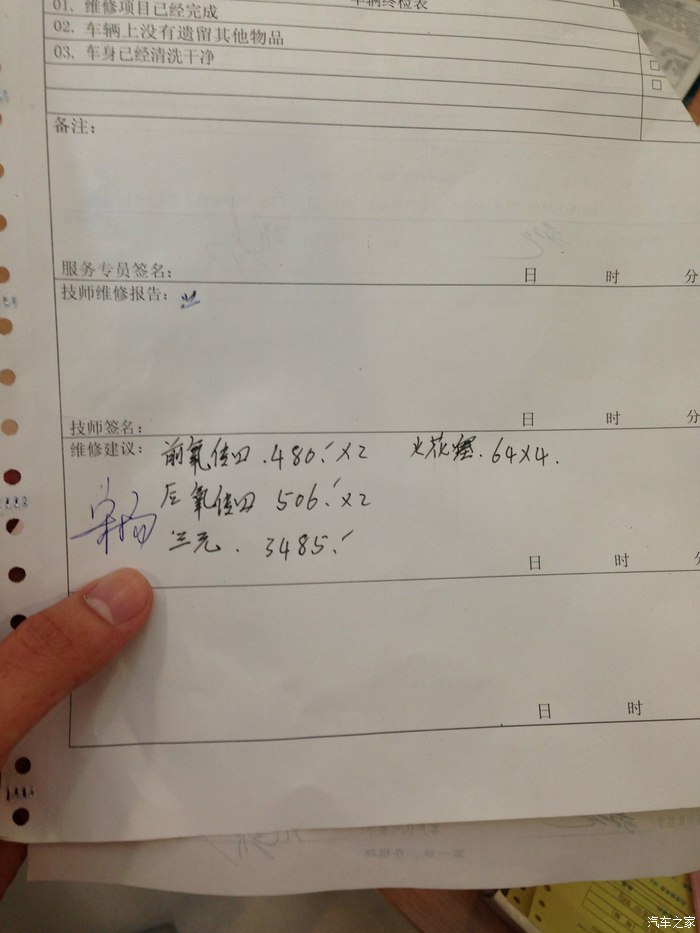 结果就是不幸言中,我的火花塞拔出来头上就是白色的,然后他们插上电脑查,我也看不懂。最后给我的结果就是需要更换火花塞*4、前氧传感器*2、后氧传感器*2、三元催化器……跟我说连工带料一共大概是9000多。