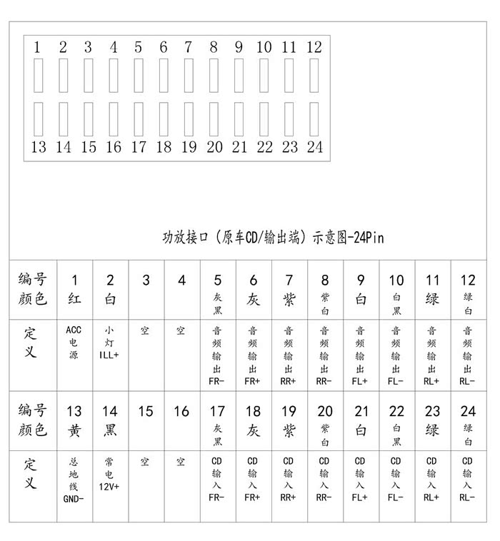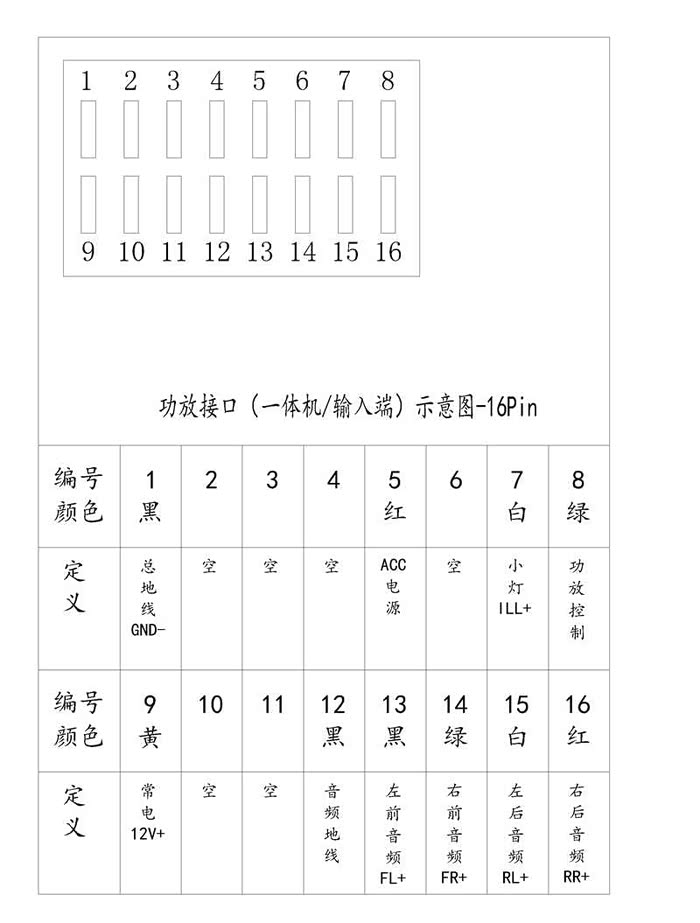 上图是功放接口(一体机端)16pin(实际使用10根线),下图是接口定义图