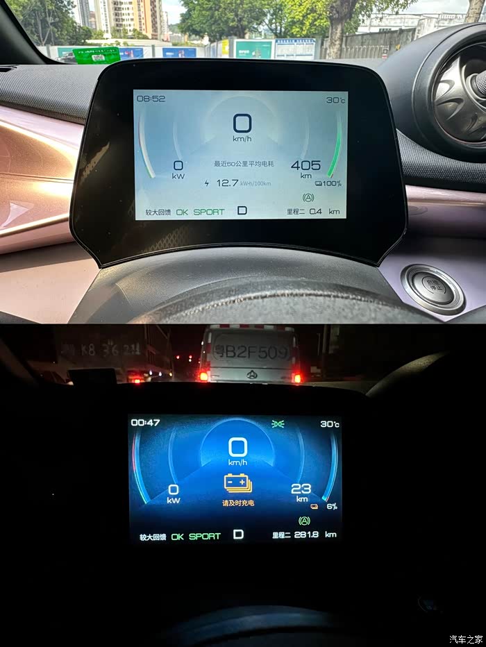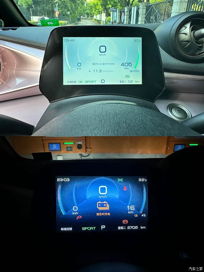 较大回馈+运动模式组合,充满电小记里程清零。续航最给力的居然是这个组合,是不是有点意外,也许因为我平时开车比较急的缘故吧,最终结果是实际行驶282,剩余续航23