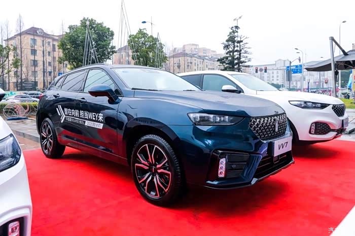 酒店门口一排气势汹汹的WEY,分别是VV7GT VV5 VV7和VV6