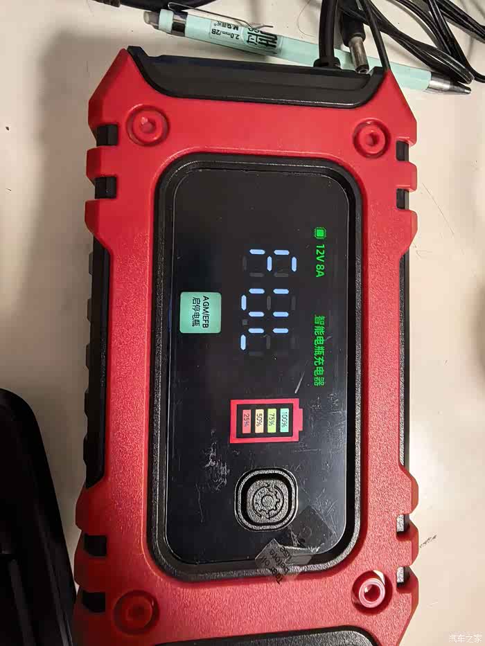 充电3个小时后提示充满。第一个小时电流大点大约在7.9A(充电器最大8安输出),后面随着电压升高,电流最小到1A多点。充满电后液位上升,由中间升到靠近高位线。