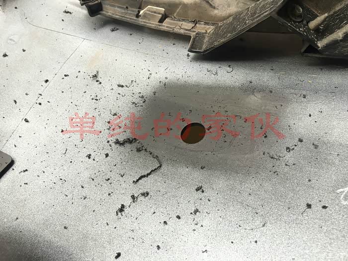 打孔之前忘记拍了,雷达支架的位置,厂家是有印子的,照着印子打就行,注意内测的小圆圈,不是标准圆是鸡蛋型的,使用卡尺或者尺子找出中心点来,做上标记打孔就可以了,