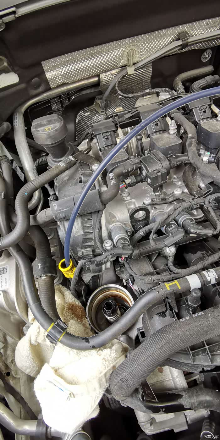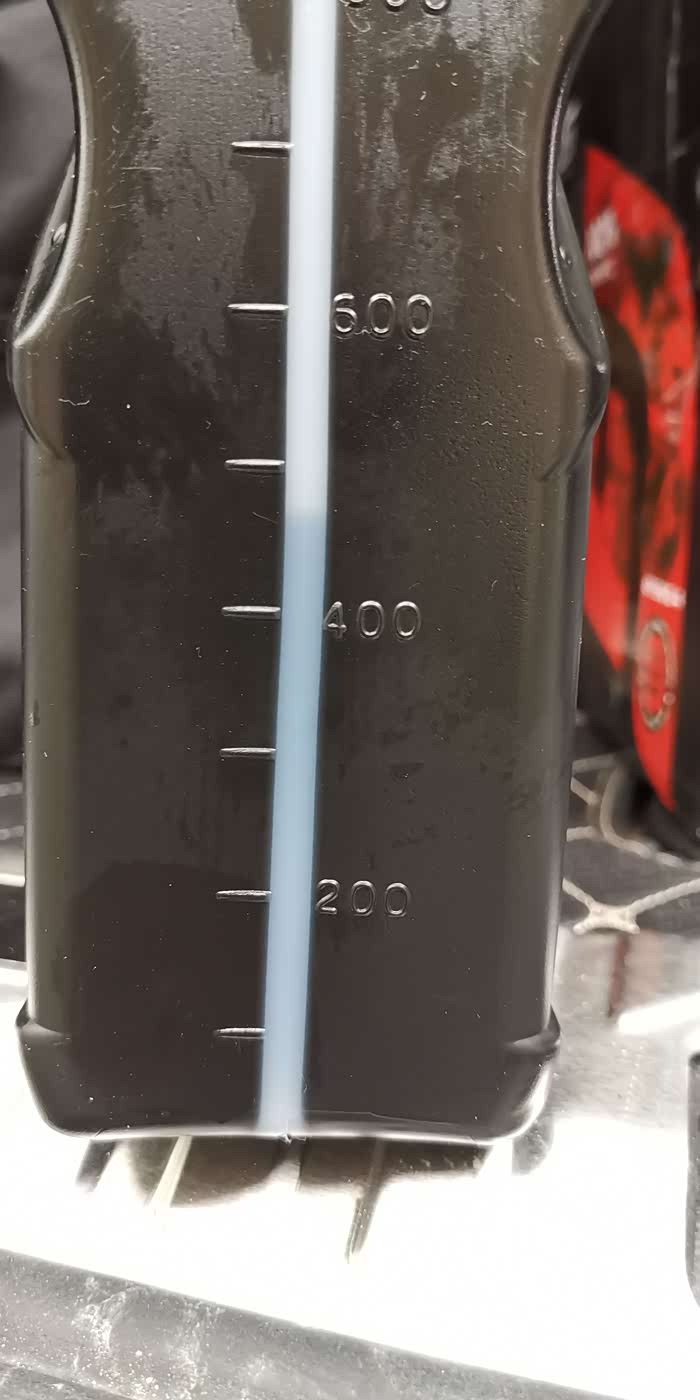 又开一瓶,小心加1升,再测不够,又加1升,,还是不够。不管了,再加,机油尺到中间了。剩余的拍个照,大家自己看,加了多少。
