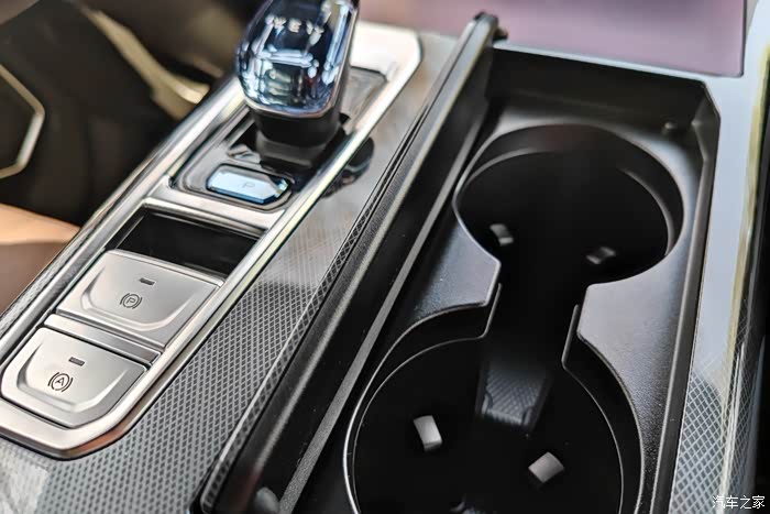 中控面板的材质摸着挺舒服,各种按键的质感反馈也十分细腻,前排的水杯架深度不错,放水挺稳。