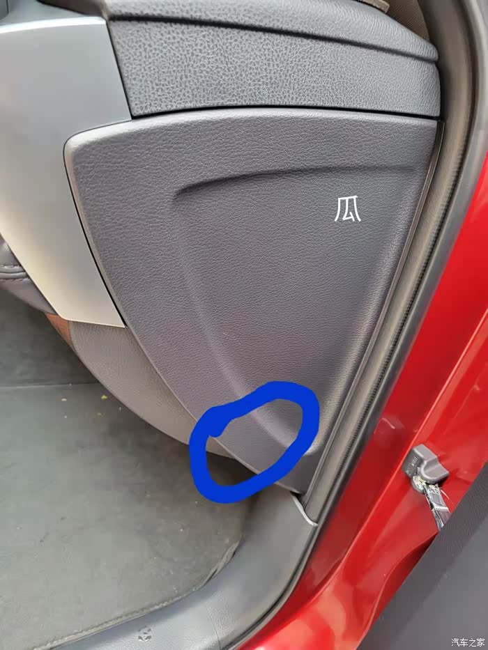 2、副驾门打开后盖板打开画蓝圈位置里面有个悬空的塑料件抖动会撞到周围,贴泡棉之后解决。