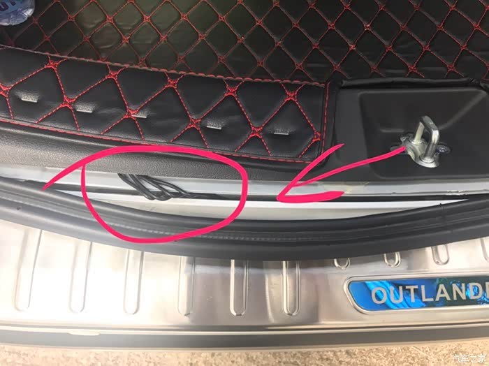 拆掉尾部密封条后可以看到有条大概1厘米的缝隙、没错后雷达线就是从这条缝隙穿上来进入后尾箱
