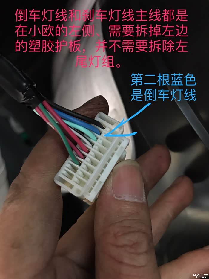 拆掉尾箱左边护板后有一个最大的插头在尾箱后板上固定着、第二根蓝色线就是雷达接倒车灯的线