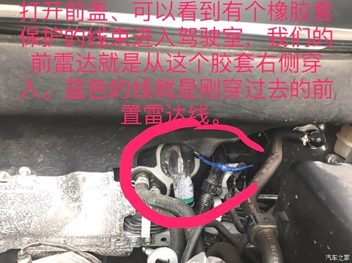图中红圈圈住的位置就是主线进入驾驶室的、蓝色的线就是刚穿进去的雷达线、从右边比较容易穿进去。