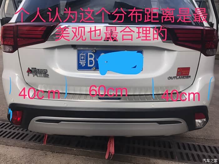第三步就是安装尾部雷达:欧蓝德车型宽度1610mm,虽然大部分雷达说明书都标注了最佳安装尺寸、但是我经过多次比对认为不能以上尺寸最为合理:因为尾部中间有摄像头、所以中间雷达间隔距离设定为600mm、两边各为400mm。如果两边太靠边从后面发现很不协调,装雷达虽然是为了安全但是也要兼顾好看吧。