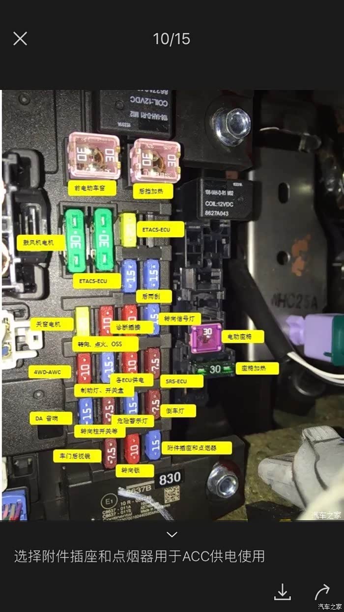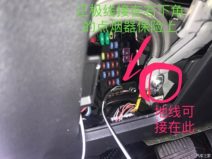 绿色字体箭头标示位置为ACC+电源取电位置、在保险盒右下角的点烟器保险上。负极直接接在红色字***置即可。