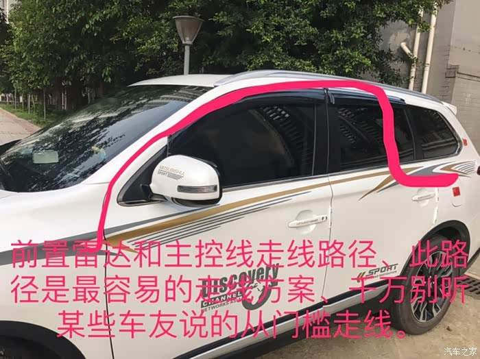 我认为前置两个雷达足够、完全没必要安装4个雷达。论坛里有车友也反馈过前面雷达会导致等红灯时误报警、所以主要两侧加装就够了,防止拐弯和入库时两边擦到,字数限制穿线在下面图片说明