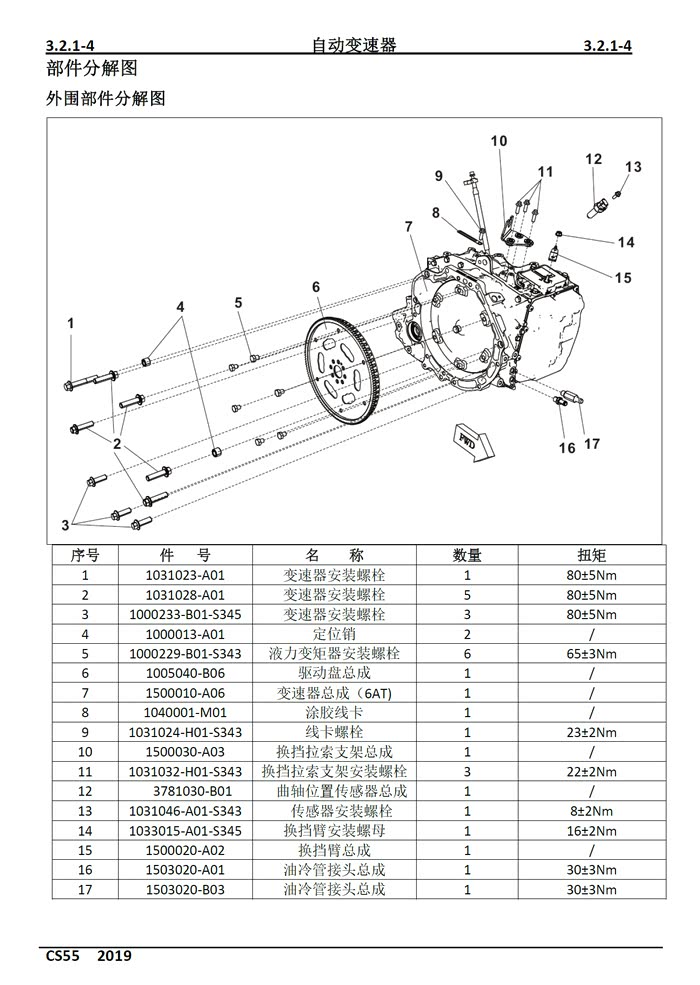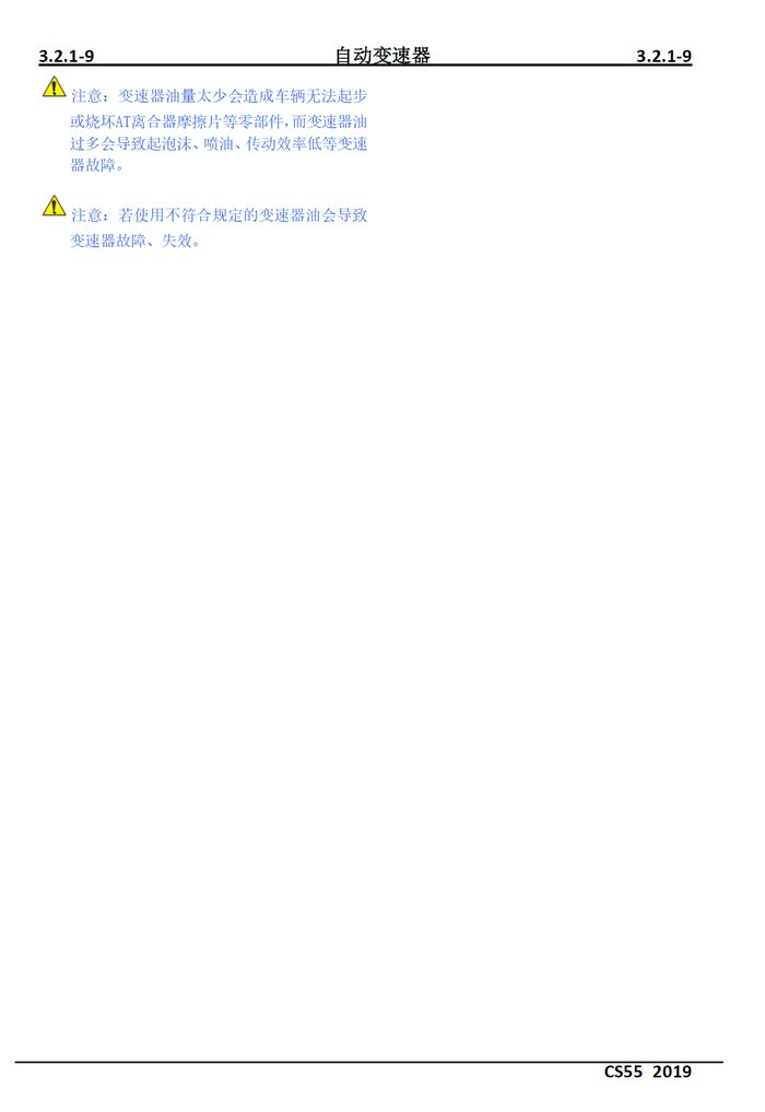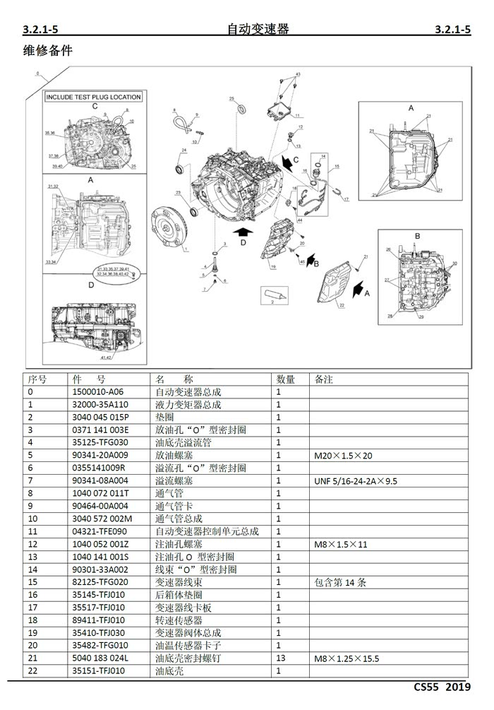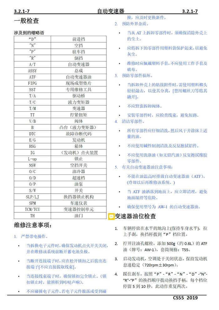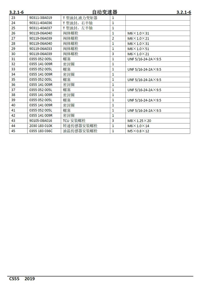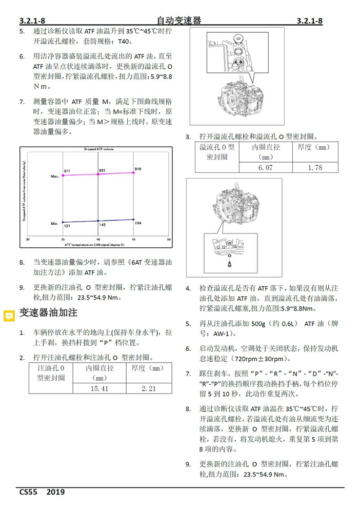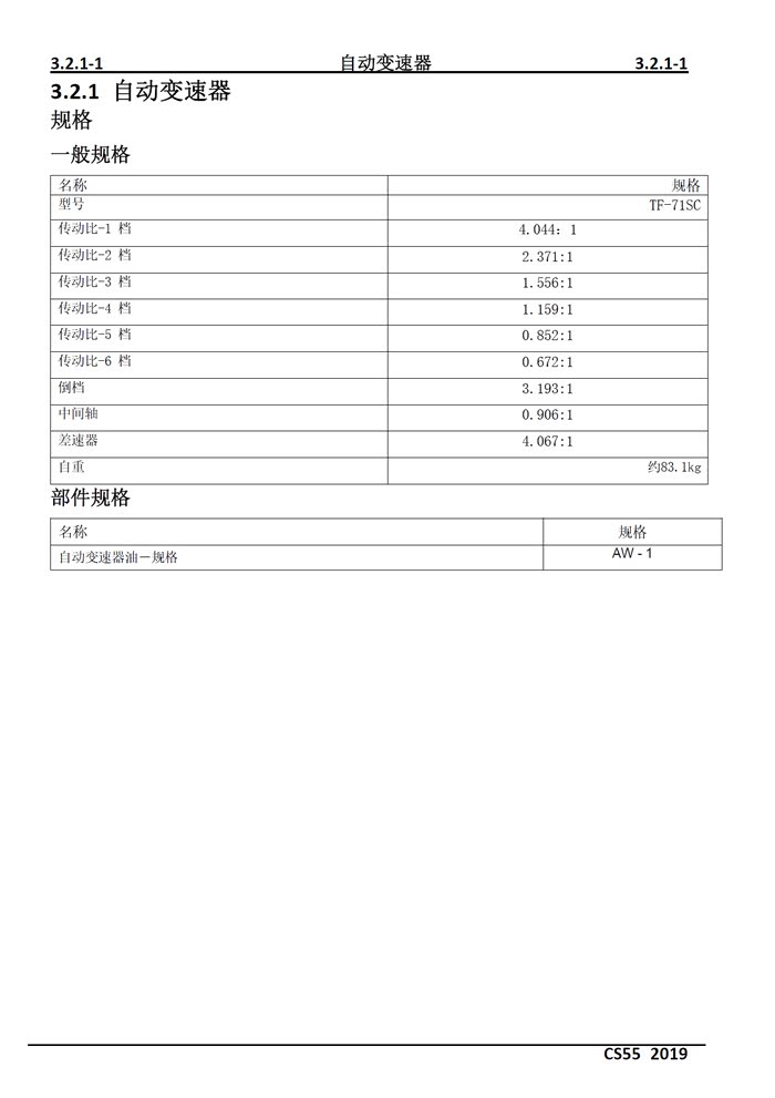 维特拉和长安CS55的变速箱型号一样,都是TF-71SC。下面是2019款CS55的维修手册变速箱换油和油位检查方法,供车友参考。