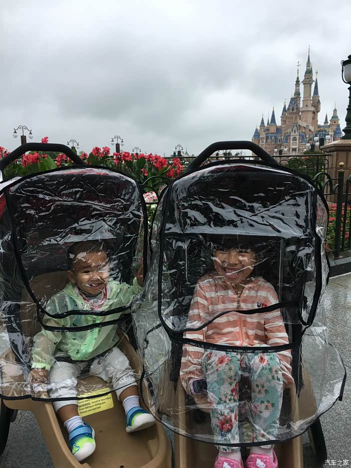 真正进入园区后第一件事就是租童车(70元每车每天),买防雨布(60元每个)、买雨衣(60元每个)、买雨伞(180元每把),在这里真的是钱不是钱。。。全部置办齐全后已经是中午,而且雨越下越大,穿过米奇大街终于看到了盼了几十年的迪士尼城堡