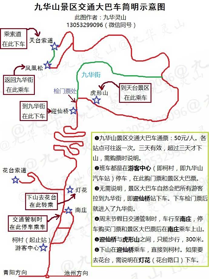 ●除了自驾车和包车以外,其他方式到九华山都是先到九华山游客服务中心(包括九华山汽车站、景区门票售票处、景区大巴换乘处)所在地是柯村,在山下。在游客服务中心购买门票和交通票后再乘景区大巴上山。