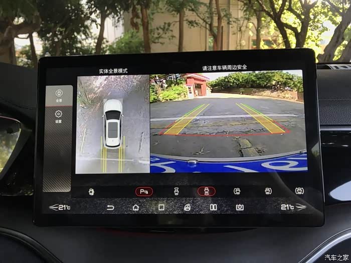 车子带有360°全景影像,还有倒车轨迹预测,就算我这种新手女司机也能把车停的规规矩矩的,超方便!不光是倒车,它还能显示左右盲区的影像,在会车或者拿不准距离的时候也可好用了。