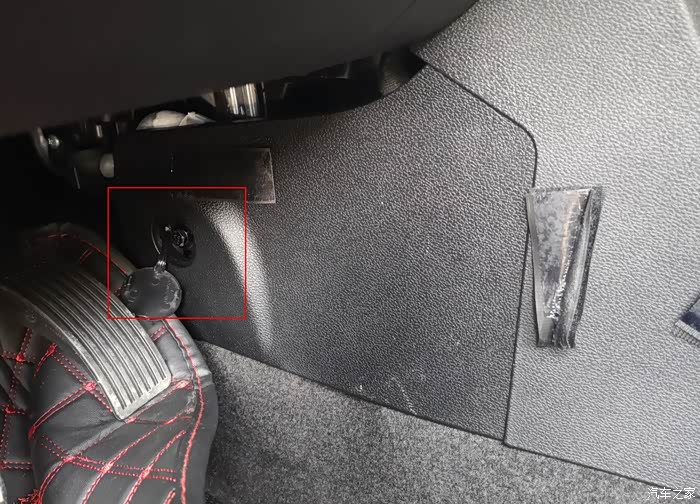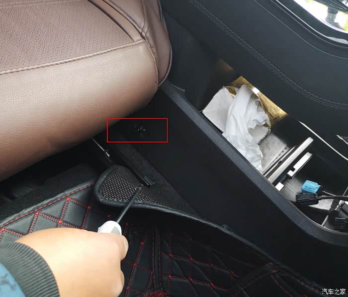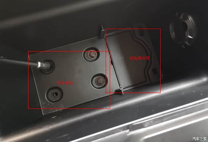 取下扶手箱四颗螺丝,并将钥匙感应器撬开往下塞,防止移扶手箱的时候线束被拉断。