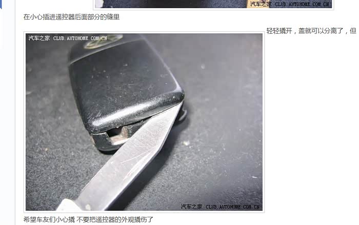 今天按照旗云3论坛的方法换遥控器电池,结果把手都戳破了,因为网上的方法不对。建议大家俺我的方法来。