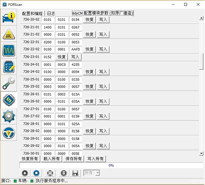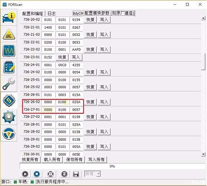 扫描到的车辆控制模块BCM参数,按照Ford的资料,换完LED或氙气灯要修改726-26-02和726-27-01参数