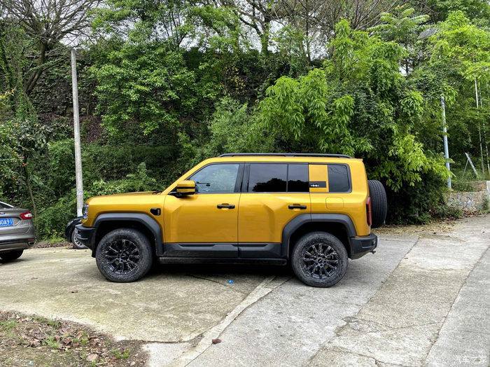 驱车一个多小时终于到达了目的地,停车熄火抽根烟放松下再给我家豹子拍张照片。这金色的车漆配上黑色的轮眉特别惹眼。离地间隙比较高,轮毂和轮眉的间距够大,虽然我还没试过正经越野,但这外形条件看着就是越野的一把好手,至少通过性不会差。