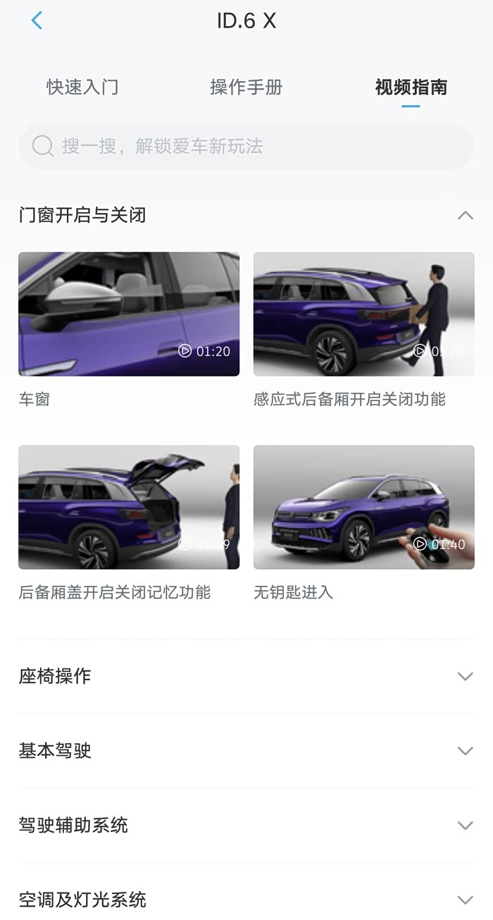 手册:对于新手来说,电动车的功能很复杂,传统的模式,都是给一本很厚的纸质手册,对于ID6X,我们可以在手机端进行学习,这样就可以不需要带笨重的纸质手册啦,很方便。