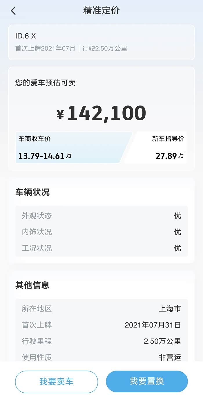最后说一下官方二手车功能,我们可以把车辆的详细信息输进去,大众会提供一个二手车的估值,我这辆车目前给的价格是14.21万元,也就是说已经腰斩了,电动车贬值太快了。