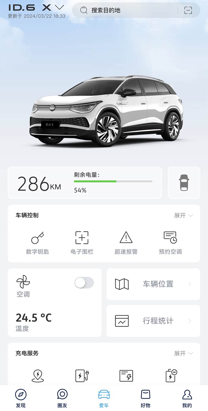 手机与车机功能协同:对于电动车来说,智能化是非常重要的功能,智能化很重要的体现就是可以通过手机来进行功能操作。对于ID6X,我们可以通过手机来预约空调、充电场景设置、设置电子围栏等。我经常使用预约空调功能,我们可以根据自己的用车习惯来进行设置,这样的话,上车后就可以享受一个美妙的环境。