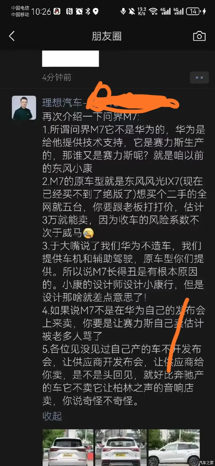 举报/纠错问界新M7到底冻了谁的奶酪?自从问界新M&上市后,理想和问界的摩擦就越来越多。最近,一位理想汽车销售在朋友圈向问界开炮(全文放在截图),他从三个方面认定问界没发展,火药味儿十足:1、华为不造车。只是提供技术支持,问界就是赛力斯,也是以前的小康,问界不等于华为。2、M7原型车是东风X7 ,设计丑。3、如果M7没有上华为发布会,还有多少人会买?