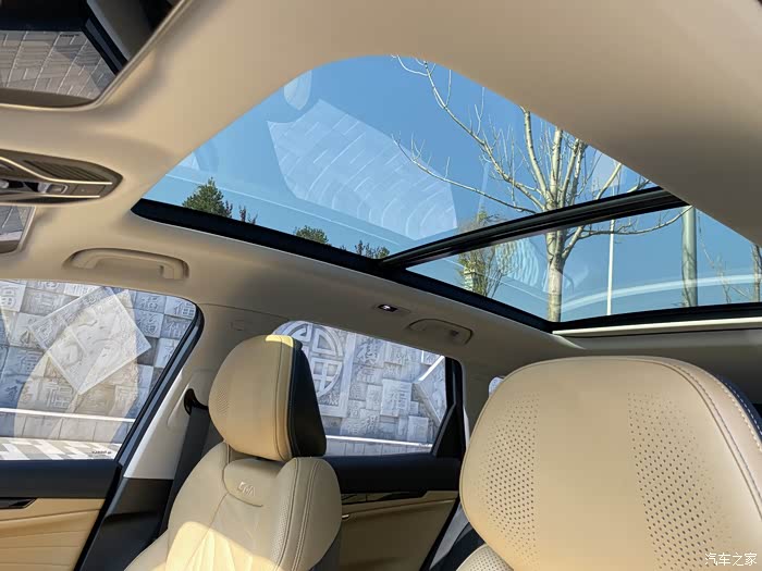 车辆的车声尺寸较大,给到了车内一个充足的乘坐空间和储物的空间,再加上特制的座椅,符合人体学设计,坐上去非常舒服。车内前后都有空调的出风口,头顶一个超级的大天窗,都能够营造出一个舒适明朗的乘坐环境。
