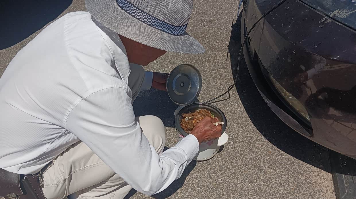 8月17日:早上出发去黑独山,一路上十分的荒凉,基本上是沙漠和戈壁滩。11:25到达被誉为水墨画的黑独山。还挺多人的,拍照完就离开前往德令哈市。下午六点到了德令哈千千宾馆。到农贸市场买了牛肉,鸡蛋等。吃了碗牛肉面。还买酒,回到宾馆,宾馆老板见到我拿着酒说:你们还敢喝酒呀!我在这高原从不敢喝酒。这才知道高原不宜喝酒。老板说我是他的榜样,希望他到我的年纪也能象我一样健康。晚上把牛肉卤好,明天中午吃。在网上定好了明天茶卡盐湖的门票。