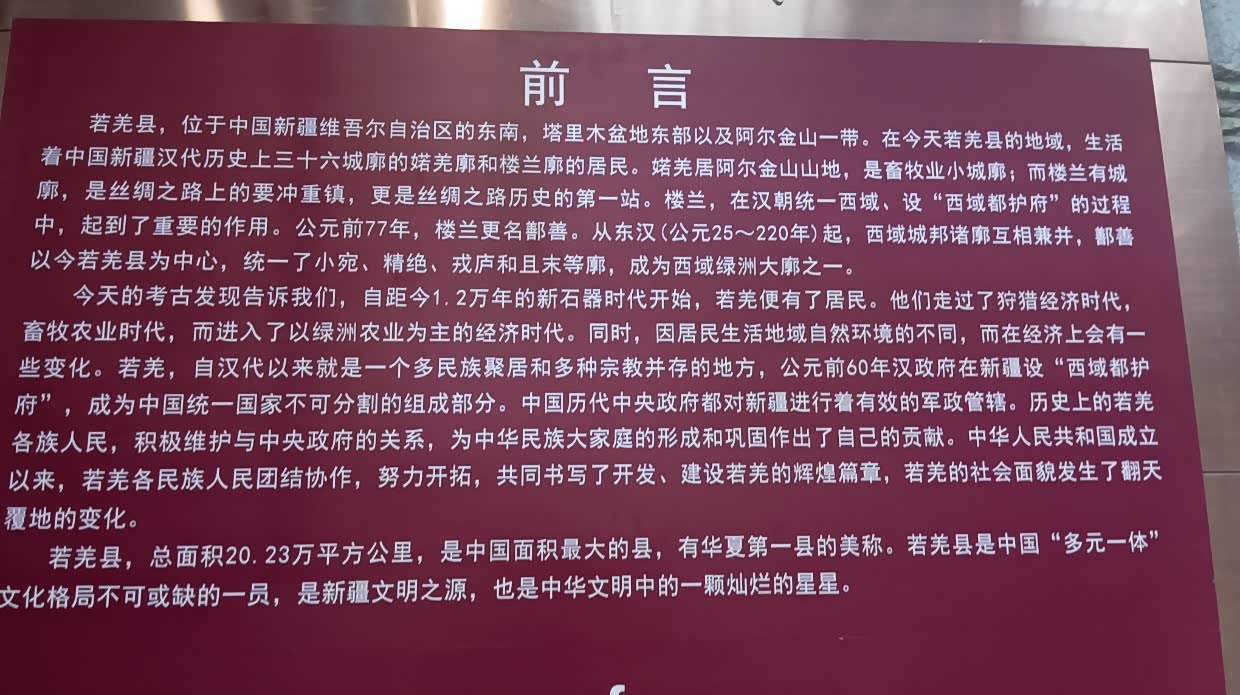 8月15日:离开轮台,前往若羌县。下午四点到达若羌县,先去参观若羌县楼兰博物馆。楼兰国一夜消失是历史之谜。博物馆中详细地介绍楼兰古国遗址发掘的经过,还有发现楼兰女尸的视频。楼兰文化广场有着复原的巨大楼兰美女的雕像。买了只烤鸡,饭后到楼兰文化广场玩。遇到一个来自四川的小伙子,和他了解从那入川好。明天就要离开新疆了,出了新疆就可能没馕吃了,再去买馕,新疆的馕的确挺好吃的,而且方便携带。