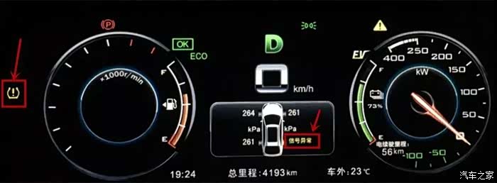 如下图右后轮显示 “信号异常”四个字,同时胎压故障指示灯点亮。说明右后轮报信号异常。