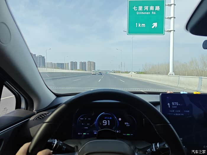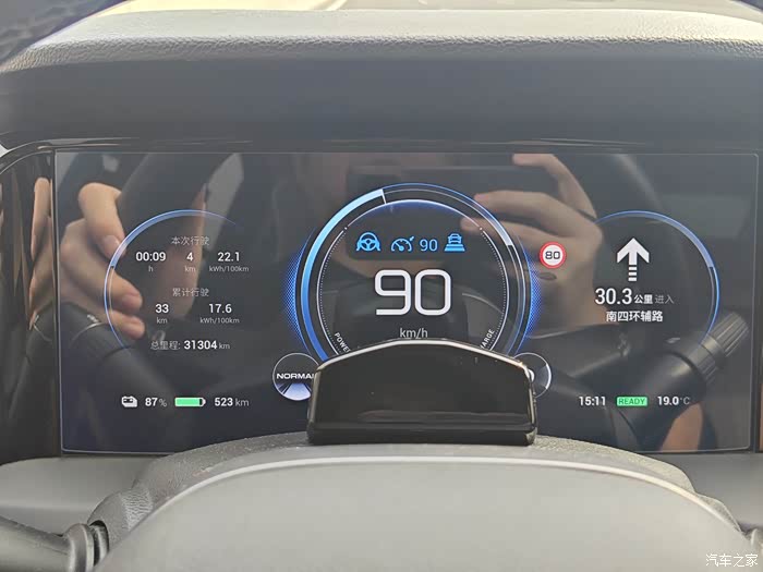 大四环这条路线不仅车流量适中,而且路面状况良好,非常适合进行续航测试。因为大四环限速80公里/小时,且表显时速比实际时速多8码,所以我将车辆定速巡航设置为90公里/小时。